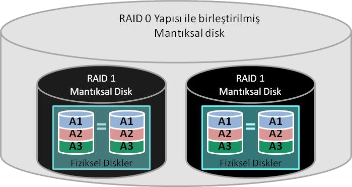 Raid 1+0 Veri Kurtarma Raid nesting denilen bir yapı ile farklı 2 raid 1’ın Raid 0 yapısı altında birleştirilmesi ile oluşturulur. En az 4 disk ile oluşturulan bu yapı Performans olarakta yüksek seviyededir. Raid 1+0 veri kurtarma hizmeti vermekteyiz.