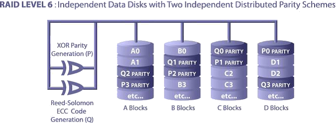 Raid 6 en az 4 disk ile yapılır. Bu yapıda Raid 5 gibi dağıtılmış pariteler kullanır. Raid 5’ten farkı ise iki ayrı parite diski kullanması ve 2 diski tolere edebilmesindir. Okuma hızı oldukça iyidir. Ama yazma hızı çift parite tutmasından dolayı Raid de ADG(Advanced Data Guarding) olarak adlandırılır. iki katı parite bilgisi saklanır. Performansı düşürmesine rağmen, iki diskin çökmesine karşı toleranslıdır. Fakat en az beş diske ihtiyaç duyar. Raid 6 veri kurtarma hizmeti vermekteyiz.